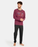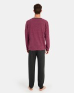 Pijama en tejido de punto tundosado. Compuesto por camiseta manga larga en color granate , cuello redondo y un estampado posicionado. Pantalón en tejido de punto de algodón gamuzado por dentro, en color gris con cintura elástica.