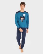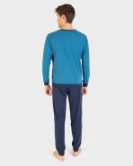 Pijama de hombre compuesto por camiseta manga larga y cuello redondo. Pantalón largo con cintura ajustable y puños.
