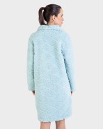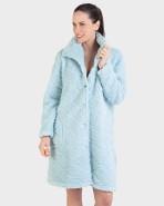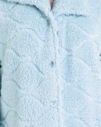Bata de mujer larga con cierre de botones en tejido color liso tipo borreguillo con un dibujo grabado en cenefa. Cuello solapa y dos bolsillos laterales .