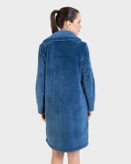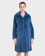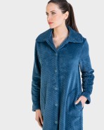Bata de mujer larga con cierre de botones en tejido polar con relieve de dibujo espiga. Cuello solapa y dos bolsillos laterales