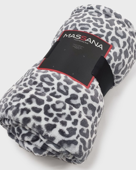 Manta en tejido polar gris con estampado animal print. Detalle de bolsillo interior para poner los pies.