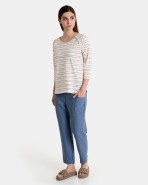 - Pantalones de mujer para figura rectangular: los de talle alto se convertirán en tu mejor aliado. Queda muy bien combinar pantalones Slim fit o incluso pitillos con camisetas holgadas, así aportarás equilibrio a las formas de tu cuerpo