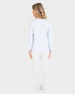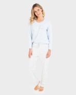 Pijama de mujer 100% algodón compuesto por camiseta manga larga y cuello en pico con estampación frontal. Pantalón largo y cintura ajustable.