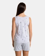 Pijama de mujer en tejido de punto estampado de rombos, compuesta por camiseta sin mangas con cuello redondo y doble tirante de fantasía. Pantalón corto listado que cuenta con goma ajustable en la cintura.