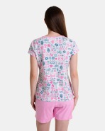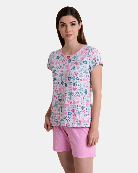 Pijama de mujer en tejido de punto 100% algodón, compuesta por camiseta de manga corta en tejido estampado con cuello redondo y acabado en forma de lagrima, pantalón corto en tejido liso color rosa y estampado de topitos en blanco, cuenta goma ajustable en la cintura.