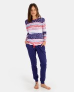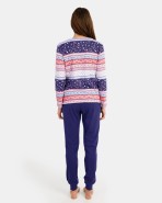 Pijama de mujer en tejido estampado, compuesto por camiseta estampada, manga larga y cuello redondo y bajo con tira ajustable. Pantalón largo liso con bolsillos laterales y con goma en cintura