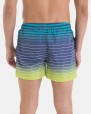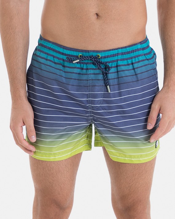 Bañador hombre en tejido de secado rápido, rayas en color azules, blanco y verde. Bolsillos laterales y goma elástica ajustable con cordón.